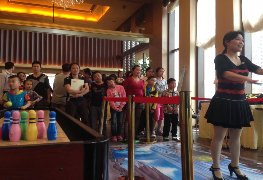 在亲子游戏嘉年华中,除了体感游戏水果忍者,还有桌上保龄球这一深受男女老少喜爱的游戏。现场客户排起长队,积极参加这一游戏。“真正的保龄球,受场地和价格的原因,平时接触的也比较少,只有在电视上看过”一位刚刚参加完桌上保龄球的客户这样说道。