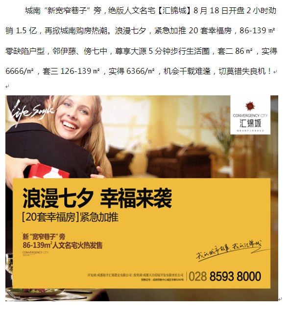 【汇锦城】浪漫七夕,紧急加推20套86-139幸福房